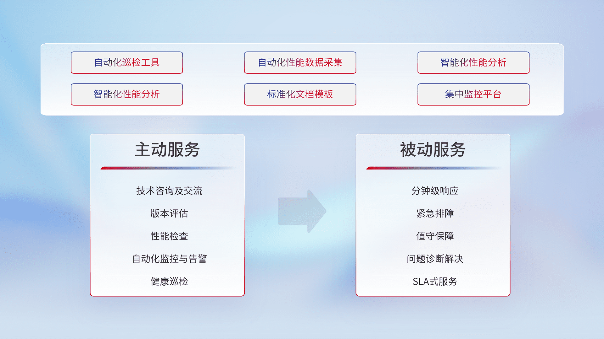智能化工具和标准化文档,,保障服务质量,,提供主动服务(包含技术咨询、、、、版本评估、、、、性能检查、、自动化监控与告警、、、、健康巡检)和被动服务包含(分钟级响应、、、、紧急排障、、、值守保障、、、、问题诊断解决、、SLA服务)。。。。